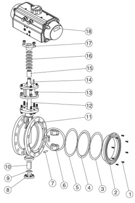 氣動(dòng)法蘭調(diào)節(jié)蝶閥默認(rèn)配AT型雙作用氣動(dòng)執(zhí)行機(jī)構(gòu)(選配單作用氣動(dòng)執(zhí)行機(jī)構(gòu)),可配電磁閥換向閥(AC220、DC24V、防爆型)、限位開(kāi)關(guān)(閥位反饋、防爆型)、空氣過(guò)濾減壓閥(氣源三聯(lián)件)